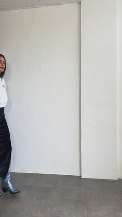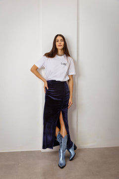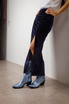 Falda de tejido terciopelo con purpurina ycon fruncido lateral que estiliza con su corte final. Ideal para acompañar el top bianca o cualquier prenda estructurada.