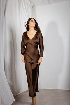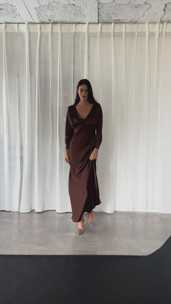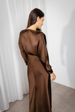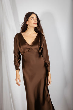 Vestido marrón chocolate y cuerpo con pliegues. Si no quieres perder elegancia para ganar en comodidad este es tu vestido. El tejido ligeramente elástico dibuja la figura sin marcar, para que te sientas segura y puedas seguir el ritmo de la noche.